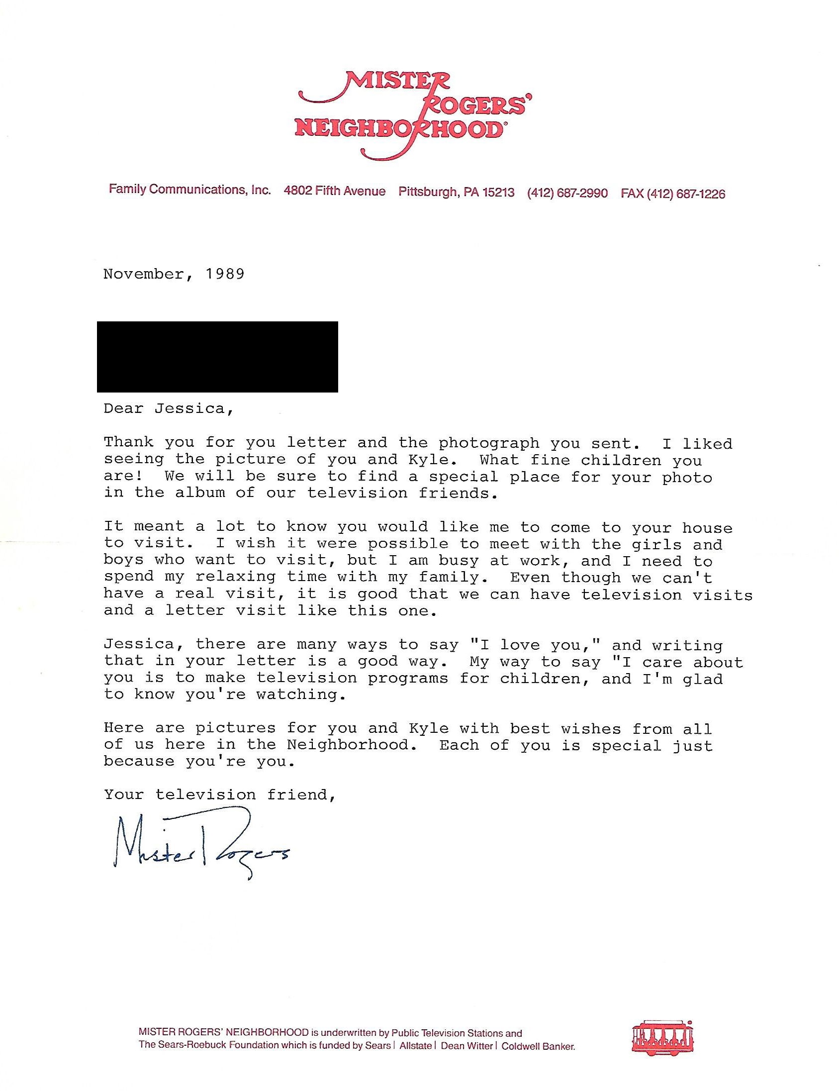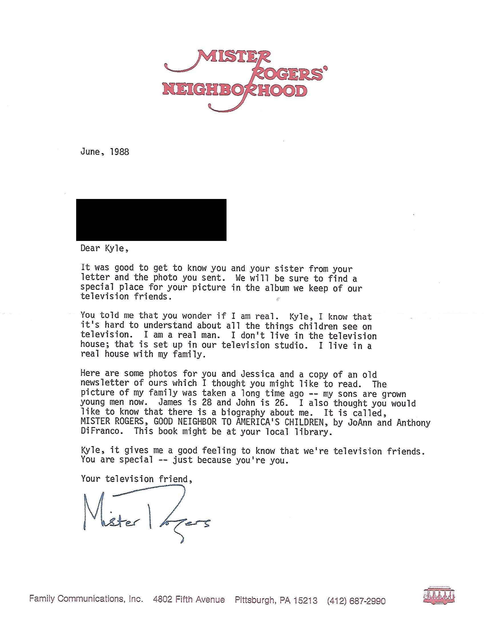 Now, as children, I (Kyle) and my sister watched this program and felt the effects of what Fred Rogers was doing and had different responses to it. I asked my mom to help me send him a letter asking if he was real, to which I got a letter back explaining that he was indeed a real person: