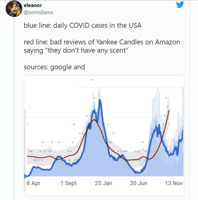 One particularly striking example of an attempt to infer information from seemingly unconnected data was someone noticing that the number of people sick with COVID-19 correlated with how many people were leaving bad reviews of Yankee Candles saying “they don’t have any scent” (note: COVID-19 can cause a loss of the ability to smell):