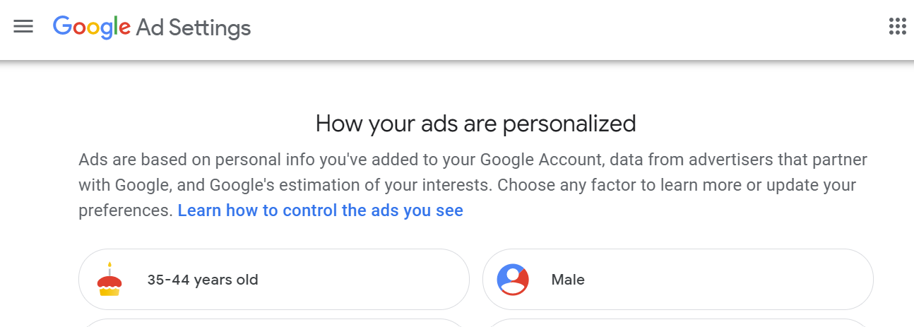 Then you can hopefully see a really long list of who Google thinks you are and what Google thinks you might be interested in, like this: