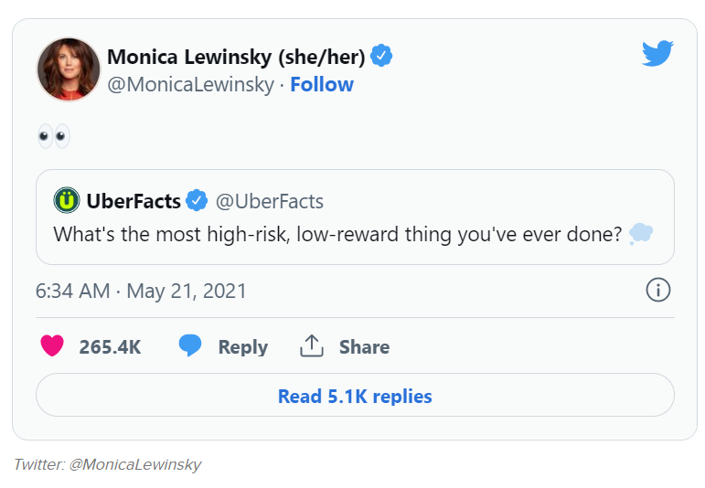 Fig. 12.5 Monica Lewinsky [l13] posted this quote tweet [l14] that answers a question with a side-eye emoji, which her audiences will understand as referring to her affair [l15] with then-US-president Bill Clinton.#
